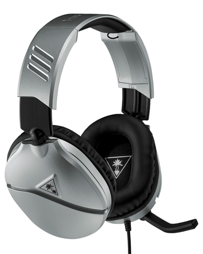 Turtle Beach® Recon 70 Silver -pelikuulokkeissa on kevyt ja mukava muotoilu, laadukkaat 40 mm:n over-ear-kaiuttimet ja korkean herkkyyden kääntyvä mikrofoni.